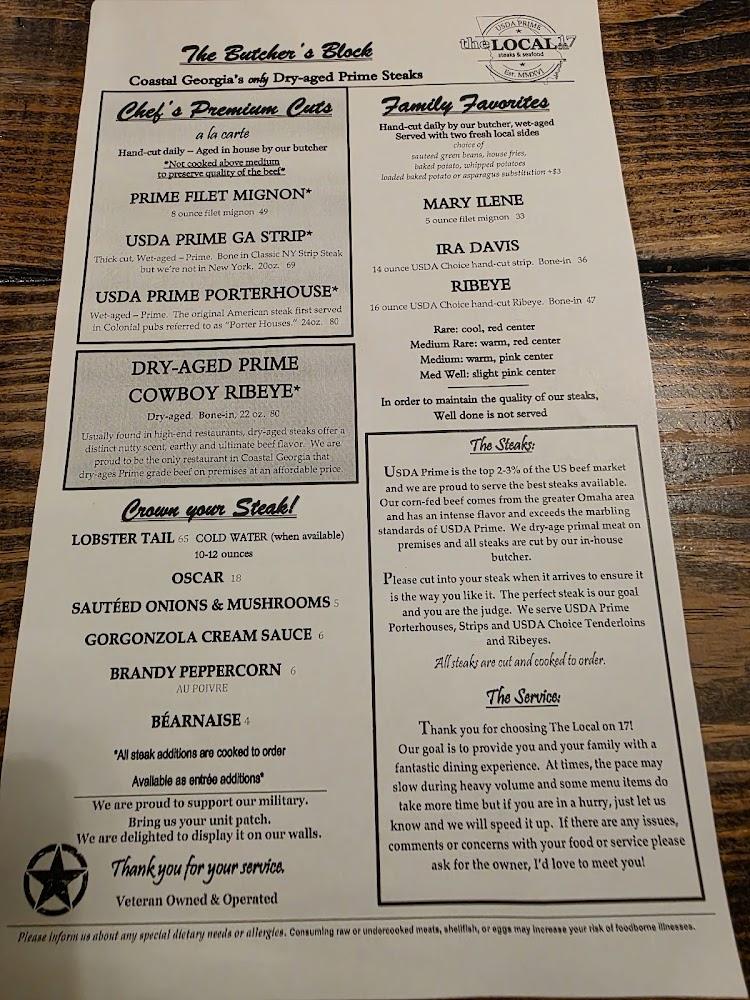 Welcome to The Local on 17 USDA Prime Steaks, where roadside charm meets culinary excellence! Located in Richmond Hill, GA, our diner is renowned for serving top-quality steaks that will tantalize your taste buds. Enjoy a relaxed atmosphere while relishing our impressive selection of local specialties, exquisite cocktails, and delectable desserts. Whether you're dining solo or with friends, our attentive service, spacious outdoor patio, and live music make every visit special. With accessible facilities and diverse dining options—including takeout and delivery—you're sure to find something to satisfy your cravings. Join us for a memorable meal at The Local!